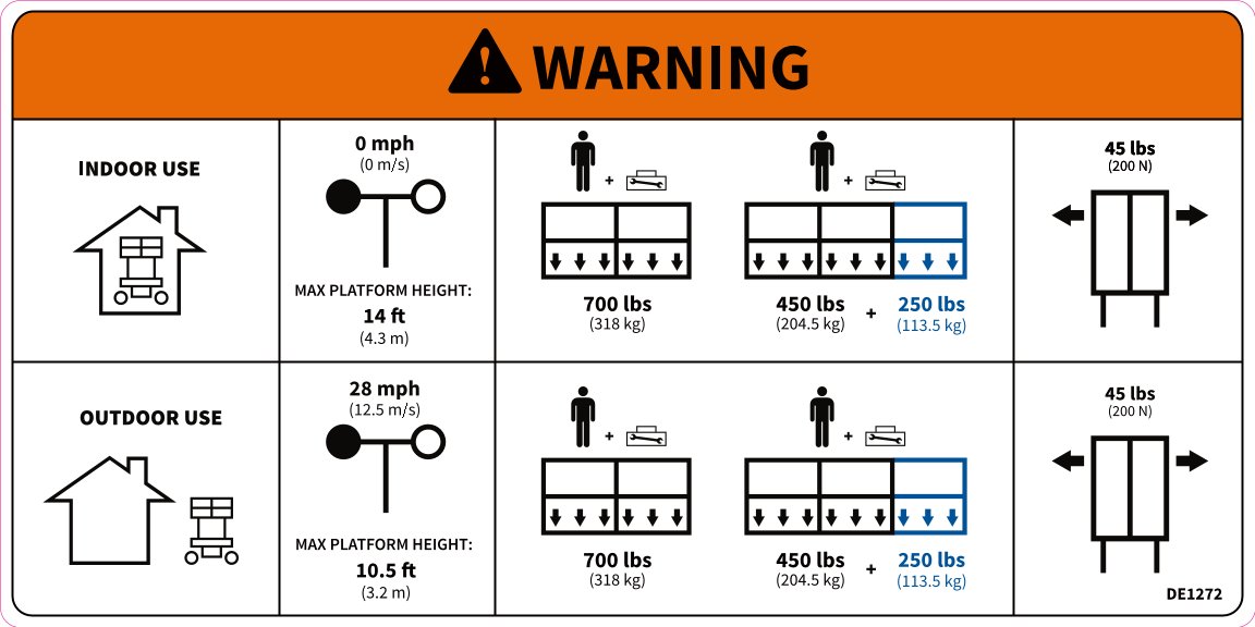 Decal,Ps-1430 Capacities (Part DE1272) is an OEM replacement part for PS1430 S5 scissor lifts manufactured by AXCS / Hy-Brid Lifts. This component is engineered for durability and proper operation to keep your lift equipment running safely and efficiently.